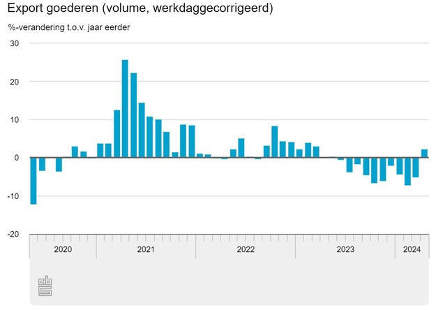 Het volume (werkdaggecorrigeerd) van de goederenexport was in april 2,3 procent groter dan in april 2023, meldt het CBS. Dat is de eerste groei in bijna een jaar tijd. Vooral de uitvoer van chemische producten, voedings- en genotmiddelen en machines was hoger dan een jaar eerder. Het volume van de goederenimport was in april 5,3 procent kleiner dan in april 2023.