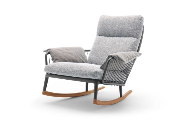 Deze schommelstoel is onderdeel van een compleet outdoor meubelprogramma met loungebanken, tafels en eetkamerstoelen. Het ontwerp is van de Milanese designer Toan Nguyen.