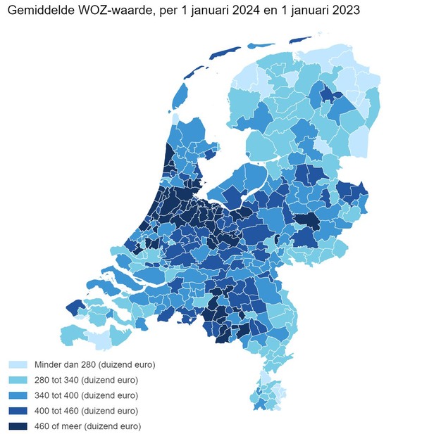 In Amsterdam daalde de gemiddelde WOZ-waarde juist met 3,5 procent tot 499 duizend euro. Mede daardoor was de ontwikkeling in Noord-Holland met een stijging van 0,2 procent het laagst van alle provincies. Wel blijft Noord-Holland met een gemiddelde WOZ-waarde van 462 duizend euro koploper, op de voet gevolgd door de provincie Utrecht met 450 duizend euro.