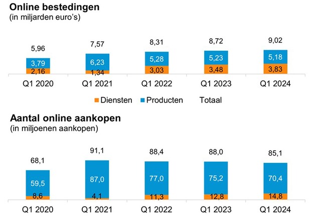 De online bestedingen aan en online aankopen van producten zijn dit jaar juist afgenomen. Vooral het aantal online aankopen van producten laat al een aantal jaar op rij een afname zien. De daling binnen aankopen is dit kwartaal vooral toe te schrijven aan de categorieën DIY/Garden (-20% t.o.v. Q1 2023), Food/Nearfood (-12%) en Schoenen en Personal Lifestyle (-9%). Wel laat de data zien dat consumenten vaak meer producten in één online aankoop bestellen, waardoor de online bestedingen minder hard dalen.