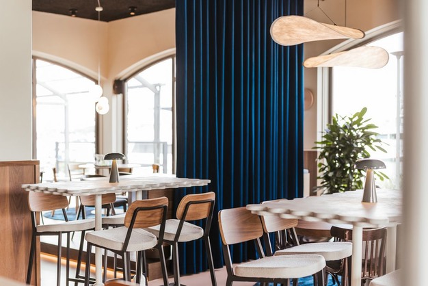 Voor de inrichting ontwikkelde Goedkoop en collega's een kader-concept. "Daarop kwam Creneau met het thema Dance between Water and Land waarmee het ontwerp de locatie - ingepolderd land - weerspiegelt, en dat zie je overal in terug. In de kleurstelling, materialen, texturen en vormen. Zo worden water en aarde op verschillende manieren gepresenteerd. Neem de grondlagen in de bar en keuken, alsof die ook ingepolderd zijn, of de golfjes in de houtafwerking, het ripple-effect op wanden en in de verlichting, het gordijn in de vorm van een zeil en de golvende beweging van de tafels. Veel van die dingen heeft Creneau niet alleen ontworpen, maar ook zelf gemaakt in hun eigen atelier."