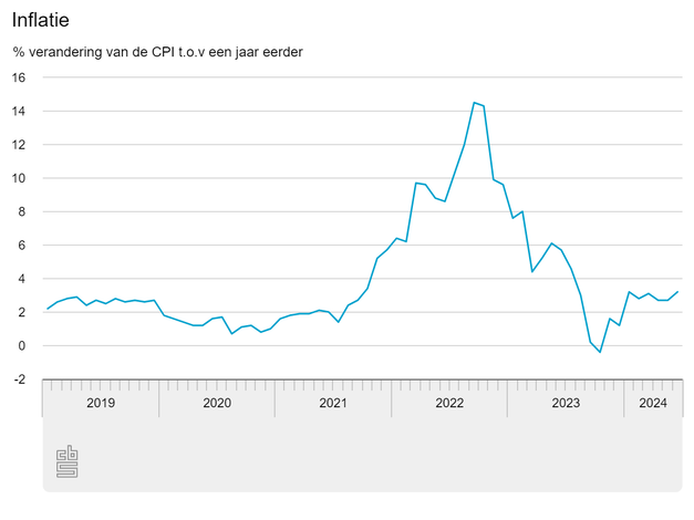 Bij de snelle raming was de inflatie in juni 3,2 procent, meldt het CBS. Deze raming is berekend op basis van nog onvolledige brongegevens. In mei was de inflatie 2,7 procent. De inflatie wordt elke maand gemeten als de ontwikkeling van de consumentenprijsindex (CPI) ten opzichte van dezelfde maand in het voorgaande jaar. De reguliere cijfers van de CPI van juni worden op 9 juli gepubliceerd.