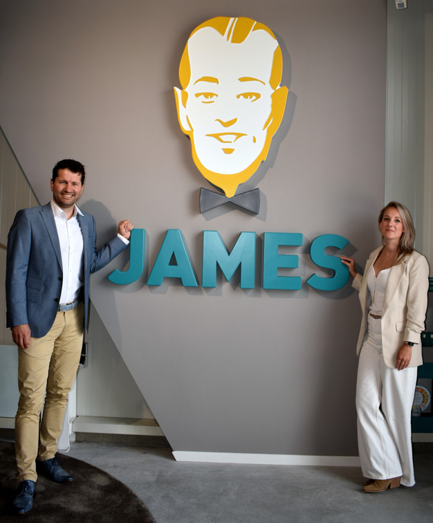 James wordt gerund door het echtpaar Marieke (37) en Martijn Peters (44). Op 1 juli jl. stonden ze precies tien jaar aan het roer. In het afgelopen decennium groeide het bedrijf op de huidige locatie in Venlo uit zijn jasje, waardoor er nu aan de overkant van de Maas een compleet nieuw pand wordt gebouwd. "Als het nieuwe onderkomen klaar is, hoeven we nooit meer te verhuizen, want het wordt op de groei gebouwd. Daarnaast is het pand op 4 kilometer rijden van ons woonhuis te vinden. Dat betekent dat we per week een dagdeel aan reistijd winnen, want nu zijn we gemiddeld genomen zo'n 20 tot 25 minuten onderweg", heeft Martijn uitgerekend.