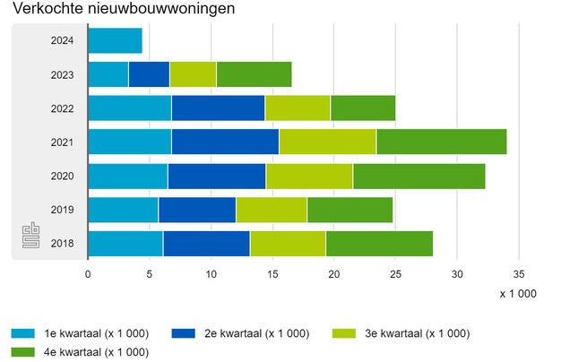 In het eerste kwartaal van 2024 werden er ruim 4,4 duizend nieuwbouw koopwoningen verkocht, 34 procent meer dan een jaar eerder. De prijsindex van nieuwbouw koopwoningen was 1,4 procent hoger dan een jaar eerder. De prijsindex voor de bestaande koopwoningen steeg met 3,8 procent, de eerste stijging sinds het vierde kwartaal 2022. De huizenprijsindex, opgebouwd uit nieuwbouw en bestaande koopwoningen, stijgt 3,6 procent. Dit blijkt uit nieuwe cijfers van het CBS, het Kadaster en Eurostat.