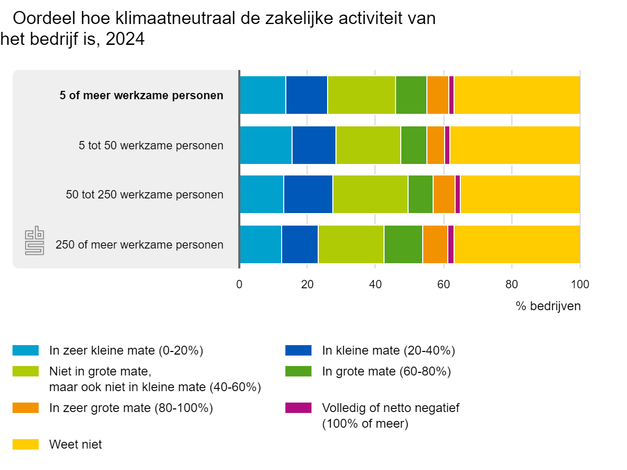 De landen in de Europese Unie willen in 2050 klimaatneutraal zijn. Bedrijven moeten dan geen broeikasgassen uitstoten of de uitstoot moet worden gecompenseerd. Een relatief klein deel van de bedrijven (ongeveer 1,5 procent) is op dit moment volledig klimaatneutraal. 26 procent van de bedrijven is in kleine of zeer kleine mate klimaatneutraal. Bijna 37 procent van de bedrijven in Nederland weet nu niet hoe klimaatneutraal ze is. Grotere bedrijven geven vaker dan kleinere bedrijven aan dat ze in enige mate klimaatneutraal zijn.