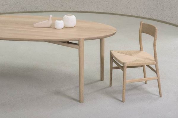 Ondanks dat deze tafel bestaat uit massief eikenhout, roept het ontwerp een illusie van gewichtloosheid op. De ovale vorm van het tafelblad in combinatie met de ranke, tabs toelopende poten versterken de luchtigheid van dit ontwerp.![]()