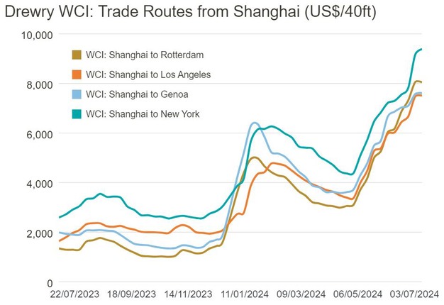 De tarieven van Shanghai naar Rotterdam zijn stabiel. In een week tijd daalde het tarief van $8.056 naar $8.048, wat vrijwel verwaarloosbaar is. Omgekeerd daalden de tarieven van Rotterdam naar Shanghai met 2% tot $631 per 40ft container. Ook de tarieven van Rotterdam naar New York daalden met 1% tot $1.955 per FEU. Drewry verwacht dat de vrachttarieven hoog zullen blijven tot het einde van het hoogseizoen.