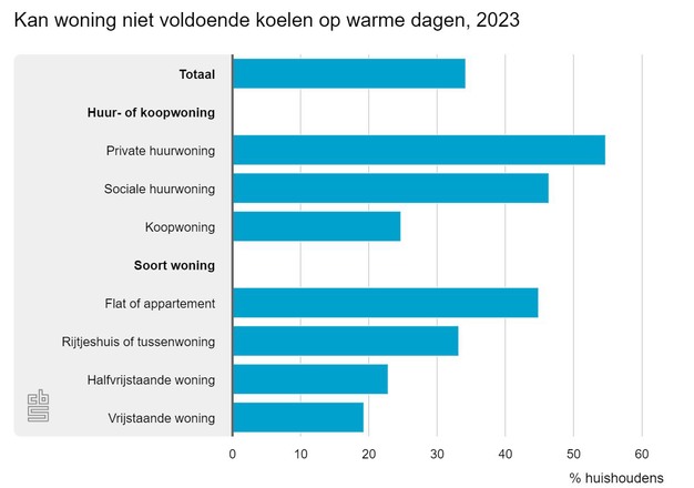 Meer dan de helft (55 procent) van de huishoudens in een private huurwoning kan de woning naar eigen zeggen niet voldoende koelen op warme dagen. 46 procent van de huishoudens in een sociale huurwoning krijgt de woning niet koel. Huishoudens in een koopwoning hebben hier het minst vaak moeite mee.