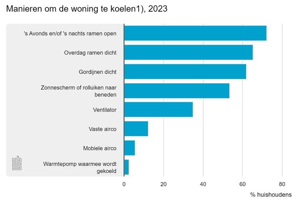 Huishoudens kunnen op verschillende manieren hun woning koelen. 's Avonds en/of 's nachts de ramen openzetten wordt het vaakst genoemd (72 procent). Ruim 60 procent houdt overdag de ramen of de gordijnen dicht. Ruim de helft maakt gebruik van een zonnescherm of rolluiken. Ruim 10 procent heeft vaste airconditioning waarmee zij de woning koelen.