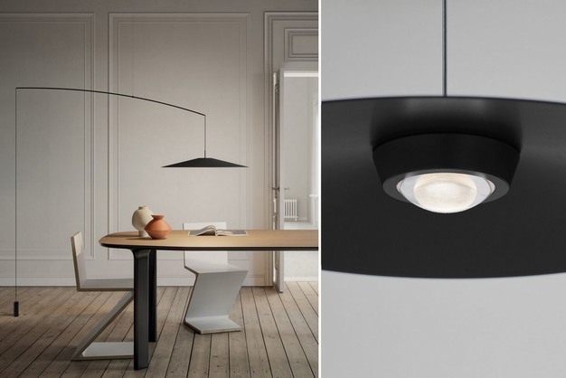 De Koinè-lampenserie van Mandalaki breidt uit met een nieuwe verlichtingsoplossing. De nieuwe Koinè is een hanglamp en een vloerlamp ineen. De lamp, met een matte zwarte afwerking (Ø 55 cm), past zich aan verschillende soorten ruimtes aan. Tevens is het mogelijk om de hellingshoek en hoogte te verstellen. De lichtbron, voorzien van een glazen lens, zorgt voor een gelijkmatige en duidelijke verlichting.