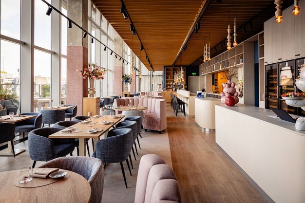 Zittend aan de eetbar kijk je direct de open keuken in, waardoor de bar ook een chef's table is. Voor private dining is het achterste deel van het restaurant geschikt, hier is plaats voor maximaal 20 personen. We zijn ook heel blij met het terras; hier kun je al tafelend genieten van een van de mooiste uitzichten over het water en Rotterdam."