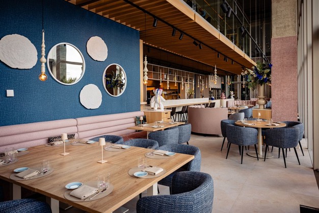 Voor het interieurontwerp is net als in Willemstad gekozen voor Jeroen Smeele van SMEELE Design. Hij ontwierp een zacht, licht en stijlvol interieur met de tinten blauw en roze in de hoofdrol en waarin het blauw verwijst naar het water. Ingrid van der Heijden: "Het water komt terug in de blauwtinten van de wandbekleding en de stoffering van de stoelen. De halfronde banken zijn bekleed met zachtroze stoffering en verder komen beide tinten subtiel op tafel terug in waterglazen en sideplates en meer prominent in diverse accessoires. Eyecatchers zijn de bijzondere langwerpige witte hanglampen in de vorm van spindels, de bloemboeketten en het meubel waarop we de kazen presenteren.