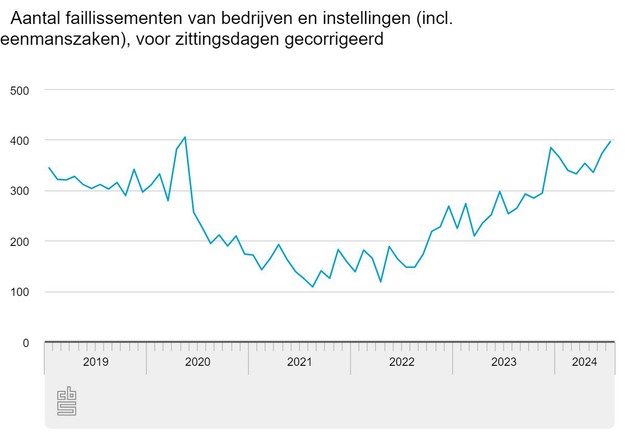 In juli zijn, voor zittingsdagen gecorrigeerd, 24 meer bedrijven failliet verklaard dan in juni, meldt het CBS. Dat is een stijging van 6 procent. In de eerste zeven maanden van 2024 zijn er ongeveer 43 procent meer bedrijven failliet verklaard dan in dezelfde periode een jaar eerder. Het aantal faillissementen lag ook hoger dan in de ruim drie jaar voor corona.
