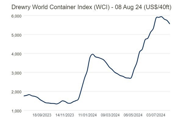 Onderzoek leert dat de World Container Index van Drewry afgelopen week (peildatum donderdag 8 augustus) met 3% tot $5.551 per 40ft container daalde. Dit is 47% lager dan de piek van $10.377 tijdens de pandemie in september 2021, maar nog steeds 291% hoger dan het gemiddelde tarief van $1.420 in 2019.