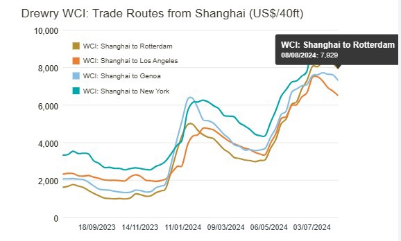 Drewry is van mening dat de spotprijzen hun hoogtepunt hebben bereikt. Echter, aanhoudende verstoringen in de scheepvaart zullen ervoor zorgen dat de spotprijzen nog enige tijd onder druk blijven.