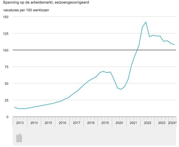 Het aantal vacatures nam in het tweede kwartaal van 2024 af met 10 duizend en het aantal werklozen daalde licht, met 3 duizend. De arbeidsmarkt werd hierdoor iets minder krap. Met 108 vacatures per 100 werklozen is de spanning echter nog steeds hoog. Het aantal banen nam opnieuw toe (+22 duizend). Dat blijkt uit nieuwe cijfers van het CBS.