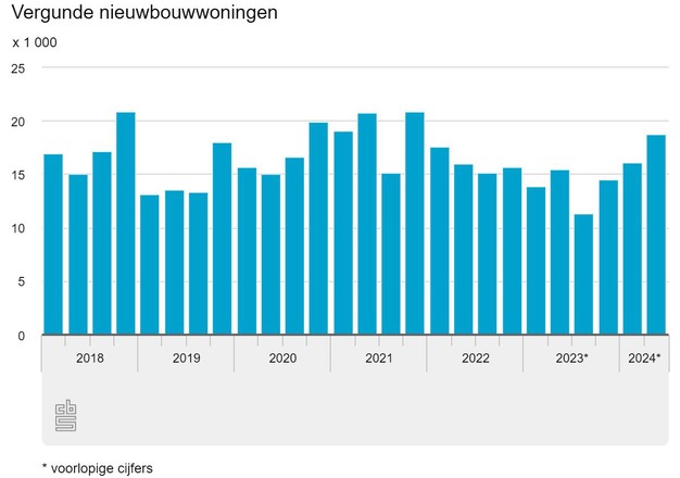 In het tweede kwartaal van 2024 zijn voor de bouw van 18,8 duizend nieuwe woningen bouwvergunningen afgegeven. Dat zijn er 3,3 duizend meer dan in dezelfde periode vorig jaar (21 procent). Vergeleken met het eerste kwartaal van 2024 nam het aantal toe met 2,7 duizend (17 procent). Dat meldt het CBS op basis van nieuwe cijfers.