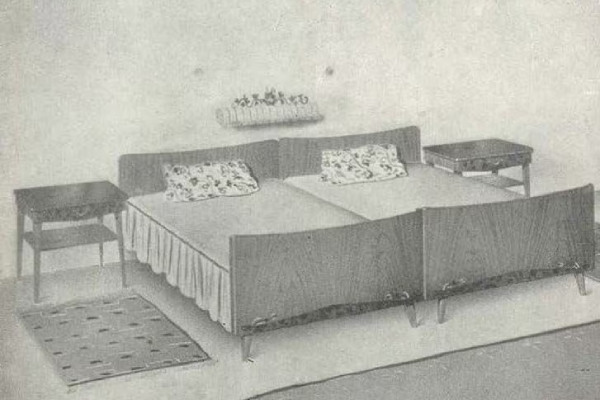 In de catalogi van 1962 werden bedden versierd met geplooide volants, waardoor onder het bed een perfecte verstopplek werd. Massief houten hoofd- en voetenborden waren een ding en bedden waren niet ideaal voor lange slapers! Kaptafels waren een onmisbaar accessoire in zichzelf respecterende slaapkamers.