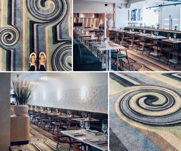De kleuren van de meubelstoffering stonden grotendeels al vast toen by MAUT begonnen met het ontwerpen van het tapijt. "Wij hebben de diep groene en ijsblauwe kleuren van de stoffering verwerkt in de strepen van het tapijt." Maar dit is niet alles. Op verschillende plekken komen de strepen samen en vormen ze dynamische swirls. De swirls zijn geïnspireerd op het mengen van ingrediënten tot een verrukkelijk gerecht. "Projectkwaliteit LANO, met wearclass 33, is geschikt voor high traffic areas als deze. Naast rekening te houden met de kleurstelling hebben wij het tapijt ook laten impregneren met een vlekwerende finish door PROGENTA."
