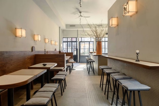 De esthetiek van With Others wordt gekenmerkt door bescheiden raffinement. Kleine vierkante tegels zorgen voor een subtiele achtergrond, terwijl het rijke walnotenhouten meubilair warmte en elegantie toevoegt. Een op maat gemaakte metalen achterbar zorgt voor een industrieel tintje, waarbij functionaliteit wordt gecombineerd met een strak, modern ontwerp. Het minimalistische silhouet van de Georg krukken biedt comfortabele, beklede zitplaatsen aan de bar en tafels. Bijpassende kussens liggen op de booths. Deze combinatie van eenvoudige elementen van hoge kwaliteit in zachte, gedempte tinten creëert een ruimte die uitnodigend en toch duidelijk verfijnd is, net als de wijnen die worden aangeboden.