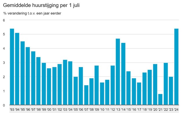 De woninghuren waren in juli 2024 gemiddeld 5,4 procent hoger dan in juli 2023. Dit is de grootste huurstijging sinds 1993, toen de huren met hetzelfde percentage stegen. Vorig jaar stegen de huren met gemiddeld 2,0 procent. Dit meldt het CBS op basis van nieuwe cijfers.