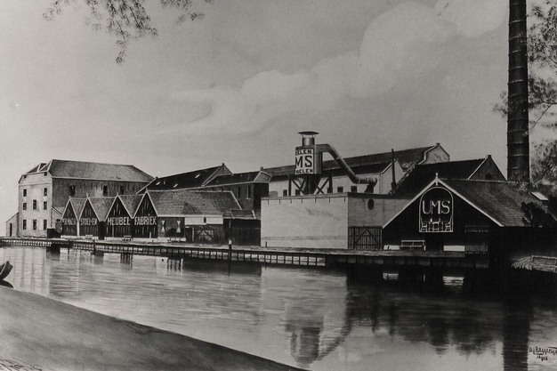 Aquarel van Dirk L. Braakman van de UMS-fabriek aan Rotsoord, 1925. Foto: Pastoe.