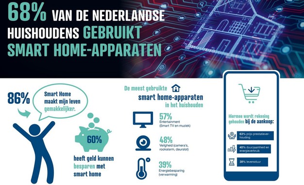 Slimme apparaten zijn inmiddels normaler dan ooit. Denk aan een slimme verwarming die je vanaf je smartphone kunt besturen, een robotstofzuiger of de smart tv. Uit onderzoek blijkt dat bijna driekwart van de Nederlandse huishoudens (68%) smart home-producten gebruikt. Vooral intelligente entertainmentsystemen zoals slimme tv's en muzieksystemen (57%), slimme beveiligingssystemen zoals beveiligingscamera's, deursloten of een deurbel (48%) en een slim verwarmingssysteem (39%) zijn populair.