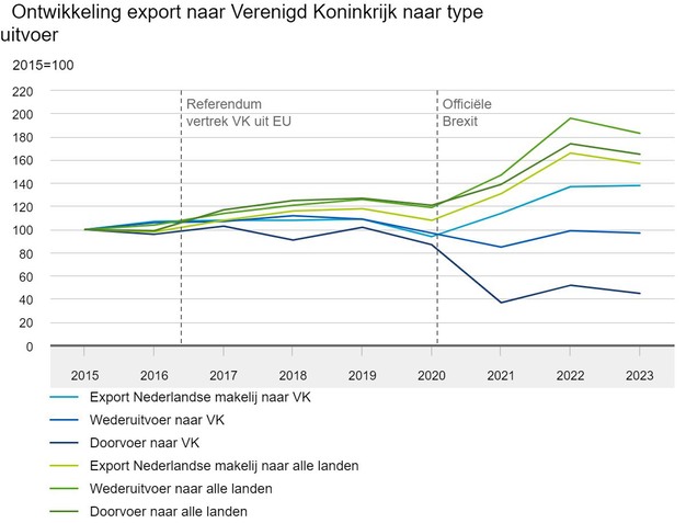De achtergebleven export van goederen is vooral terug te vinden in de wederuitvoer en quasi-doorvoer, die beide een dalende trend laten zien. De waarde van de wederuitvoer daalde in 2020 - het jaar van de Brexit - tot 3 procent onder het niveau van 2015, het jaar vóór het referendum waarin de Britten kozen voor het verlaten van de EU. Dat was nog steeds zo in 2023, ondanks de hoge inflatie de laatste jaren. De totale wederuitvoer naar alle landen daarentegen is tussen 2020 en 2023 toegenomen met 83 procent.