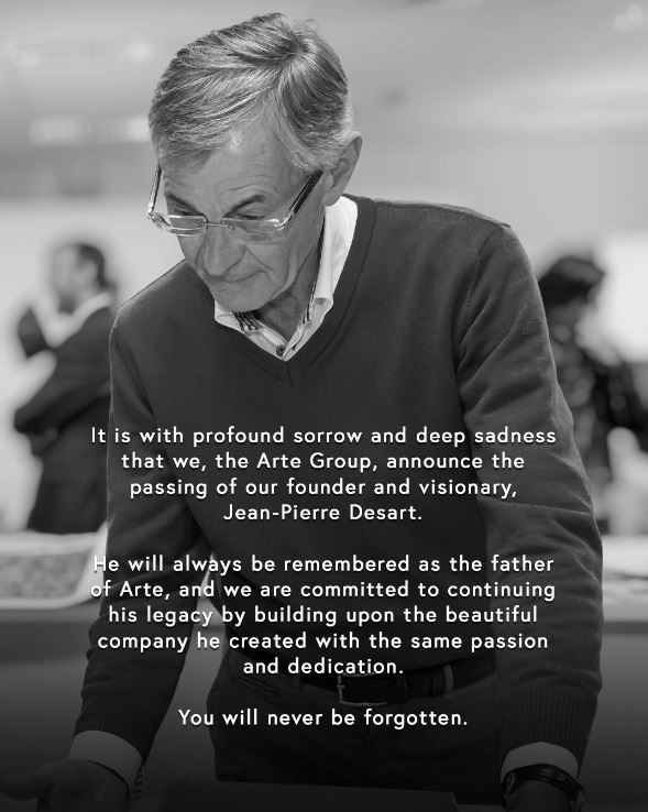 Jean-Pierre Desart, oprichter van Arte, is op 78-jarige leeftijd overleden. Het bedrijf, dat gespecialiseerd is in de productie van muurbekleding en in 1981 werd opgericht, wordt tegenwoordig geleid door zijn zonen Philippe en Steven. Mede door het werk van Desart is het familiebedrijf wereldwijd erkend.