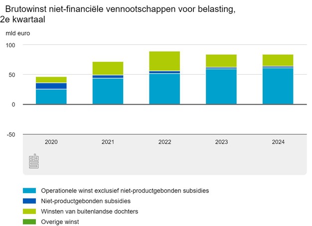 De operationele winst (inclusief niet-productgebonden subsidies) kwam in het tweede kwartaal van 2024 uit op 64,6 miljard euro. Dat is 2,1 miljard euro meer dan in het tweede kwartaal van 2023. Vooral de handel en de bouw behaalden meer winst. Daartegen realiseerden vooral de energiebedrijven minder winst. De winsten van buitenlandse dochters waren 1,8 miljard euro lager dan in het tweede kwartaal van 2023. De overige winst was 0,8 miljard euro hoger dan een jaar eerder.