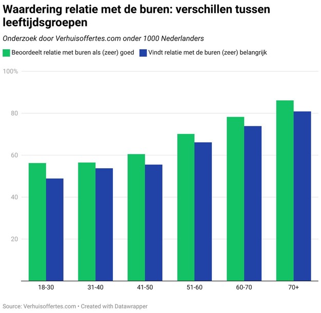 Waar de relatie met de buren een op de zes jongeren (18-30 jaar) weinig kan schelen, kijken 70-plussers daar heel anders naar. Het spreekwoord 'beter een goede buur dan een verre vriend' gaat voor meer dan 80 procent van de Nederlanders boven de 70 op. Zij vinden de relatie met hun buren belangrijk of zelfs zeer belangrijk. En nog belangrijker: in 86 procent van de gevallen beoordelen zij de relatie met hun buren momenteel ook als goed tot zeer goed. In de jongste doelgroep is dat slechts 56 procent. Tussen mannen en vrouwen bleken in dit onderzoek van Verhuisoffertes.com tot slot nauwelijks verschillen te zijn.