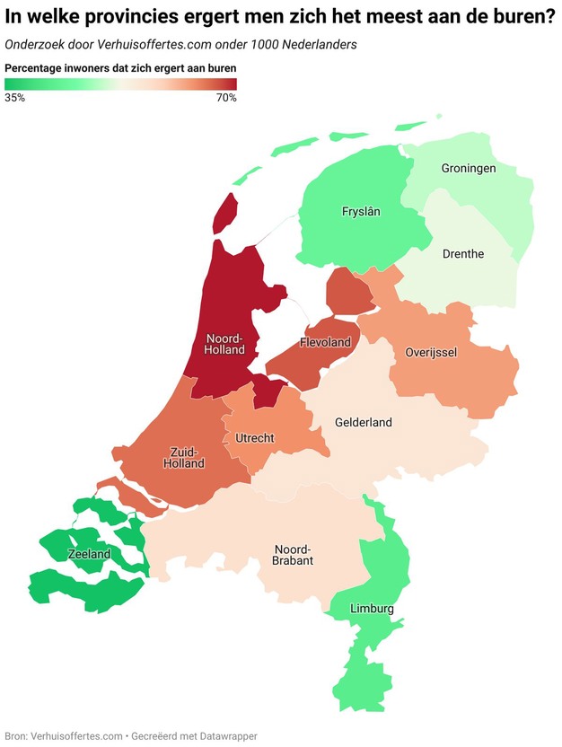 Volgens Verhuisoffertes.com lijkt het erop dat 'bij elkaar op de lip wonen', zoals in de dichtbevolkte Randstad, de verhoudingen met de buren zo nu en dan flink op scherp zet. Zo geven bijna twee op de drie Noord-Hollanders aan zich soms te ergeren aan hun buren. Ook in Zuid-Holland en Flevoland ligt het 'ergernispercentage' ruim boven de 60 procent. Heel anders is dat in Zeeland, waar minder dan vier op de tien inwoners zich storen aan hun buren. Ook Limburg en Friesland scoren relatief laag.