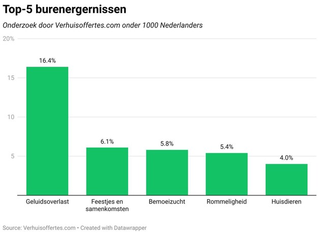 Geluidsoverlast wordt door een op de zesNederlanders genoemd als voornaamste punt van irritatie. Een kleinere groep - opvallend genoeg vooral twintigers - noemt specifiek feestjes als bron van ergernis. De ergernissen-top-3 wordt gecompleteerd door buren die zich te veel met andermans zaken bemoeien. Dat laatste wordt vaak door mannen ervaren, zoals zij zich ook bovengemiddeld vaak storen aan de huisdieren van hun buren. Vrouwen daarentegen noemen geluidsoverlast en rommeligheid vaker als voornaamste ergernis