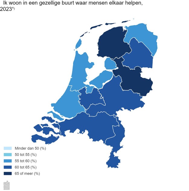 In alle provincies is de meerderheid van de mensen het (helemaal) eens met de stelling: ik woon in een gezellige buurt waar mensen elkaar helpen. Inwoners van Fryslân zijn het positiefst: daar is 68 procent het eens met deze stelling. Inwoners van Zuid-Holland zijn het met 56 procent het minst vaak hiermee eens.