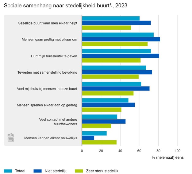 Een meerderheid van de bevolking van 15 jaar of ouder vindt dat ze in een gezellige buurt wonen waar mensen elkaar helpen. In niet-stedelijke gemeenten geven mensen dit vaker aan dan in een meer verstedelijkte woonomgeving. Ook over andere onderwerpen die te maken hebben met sociale samenhang in de buurt, zijn mensen in niet-stedelijke gemeenten gemiddeld vaker positief dan in stedelijke gemeenten. Dit meldt het CBS op basis van de Veiligheidsmonitor 2023.
