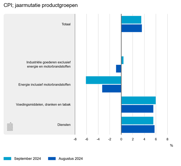 Bij de snelle raming maakt het CBS naast het inflatiecijfer ook de prijsontwikkeling van een aantal productgroepen bekend. Deze productgroepen zijn samentellingen van bestedingscategorieën op een bepaald thema, zoals alle diensten. Op 8 oktober wordt van alle categorieën in de CPI de prijsontwikkeling gepubliceerd.