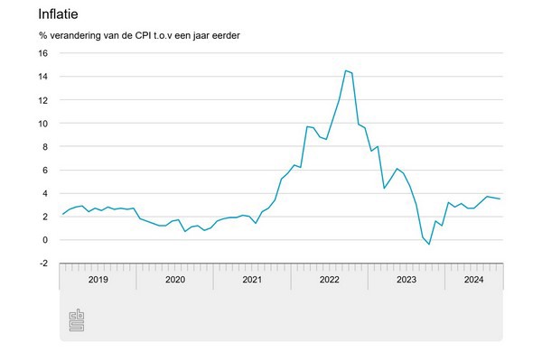 Consumentengoederen en -diensten waren in september 3,5 procent duurder dan een jaar eerder, meldt het CBS. In augustus was de inflatie 3,6 procent. De inflatie wordt elke maand gemeten als de ontwikkeling van de consumentenprijsindex (CPI) ten opzichte van dezelfde maand in het voorgaande jaar. Het inflatiecijfer van september is hetzelfde als bij de snelle raming die op 1 oktober is gepubliceerd.