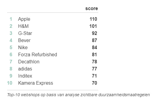 Dit jaar werden de grootste webshops niet alleen gerangschikt op hun omzet. Vooruitkijkend op Europese wetgeving heeft de HvA de websites van alle 300 partijen geanalyseerd en een score berekend voor de circulaire en duurzame maatregelen die zij – zichtbaar voor de consument – op hun website treffen. Daaruit komt een 'duurzame ranking'.