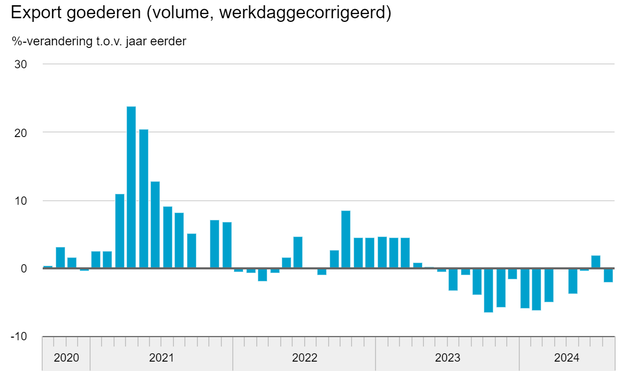 Het volume (werkdaggecorrigeerd) van de goederenexport was in augustus 2,1 procent kleiner dan in augustus 2023, meldt het CBS. Vooral de uitvoer van machines, aardolieproducten en transportmiddelen was lager. Het volume van de goederenimport was in augustus 0,2 procent kleiner dan in augustus 2023.