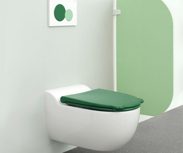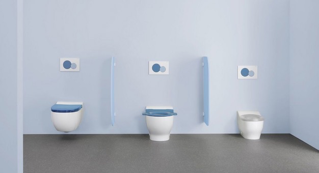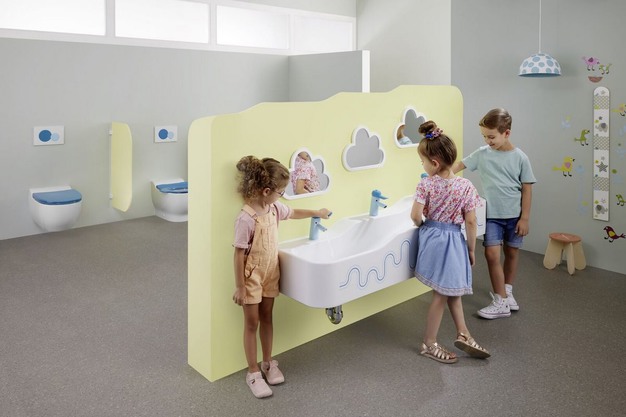 In kinderdagverblijven en kleuterscholen is het zinvol om kleuren te kiezen, die geschikt zijn voor kinderen en hun leeftijd. Het nieuwe kleurenconcept houdt in dat met name de bedieningsplaten en wc-brillen, evenals de wastafelsystemen en voorzetplaten, gecombineerd kunnen worden met de wasbakken in eenzelfde moderne kleur op kleur samenstelling. Dit geeft de sanitaire ruimte een speelse en toch tijdloze uitstraling.