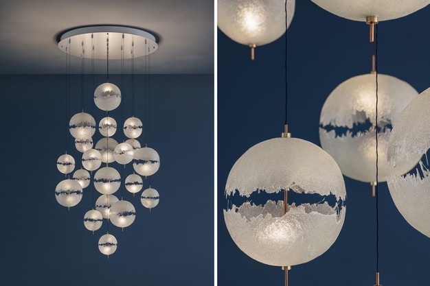 In de nieuwe PostKrisi-kroonluchter zorgt de interactie van glasvezel en de onregelmatige randen van de bollen ervoor dat het licht filtert, waardoor prachtige schaduwen ontstaan en een zachte, sfeervolle gloed wordt gecreƫerd. Dit lichteffect belichaamt de sculpturale en ambachtelijke essentie van de productie van Catellani & Smith.