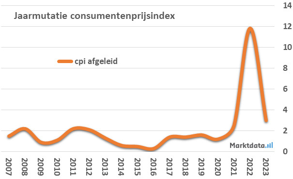 Op basis van de voorlopige cijfers van het CBS van de maand augustus 2024 is de nominale omzet in de woondetailhandel in zijn totaliteit vrijwel gelijk gebleven ten opzichte van 14 jaar geleden. Onderstaand figuur toont de jaarlijkse inflatiecijfers: jaarmutatie CPI. De reeks jaarmutatie CPI, afgeleid is de jaarmutatie CPI exclusief het effect van veranderingen in de tarieven van product gebonden belastingen (bijvoorbeeld BTW en accijns op alcohol en tabak) en subsidies.