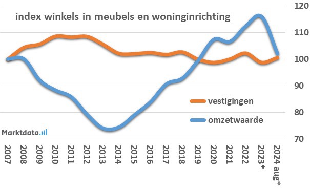 indexcijfers ontwikkeling aantal vestigingen van winkels in meubels en woninginrichting en omzetwaarde per jaar