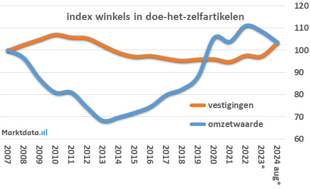 indexcijfers ontwikkeling aantal vestigingen van winkels in doe-het-zelfartikelen en omzetwaarde per jaar 2007 = 100
