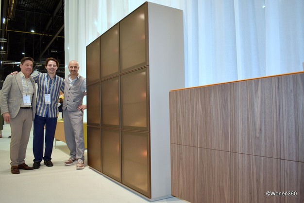 Pieter Coesel (midden) met links zijn vader en rechts agent Paul van Doremalen, met vooraan de duurzame kwaliteitskast Capri Riva 540 Sunset (met notenfineer) en naast de drie vitrinekast Cobra 963 met maronne deuren. "België is een belangrijke markt voor ons", gaf Pieter aan.