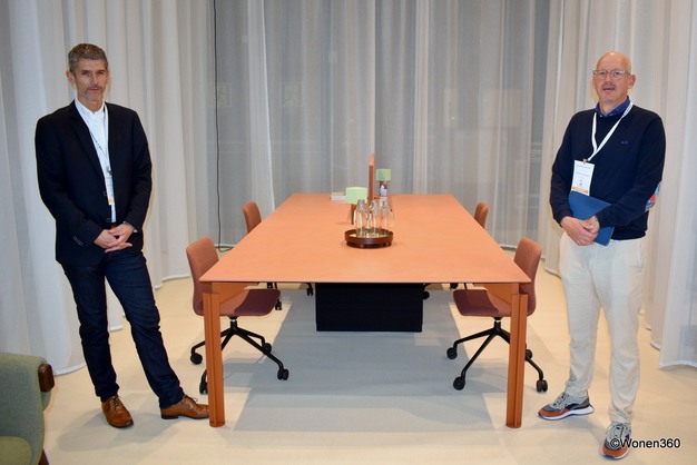 Bart Vandoorn en Steven Vermeylen van Bulo, poserend bij tafel H2O die al meer dan 30 jaar in de collectie zit en op deze beurs voorzien was van een keramieken blad, dat onder druk van 25.000 ton geperst is en dus krasbestendig.