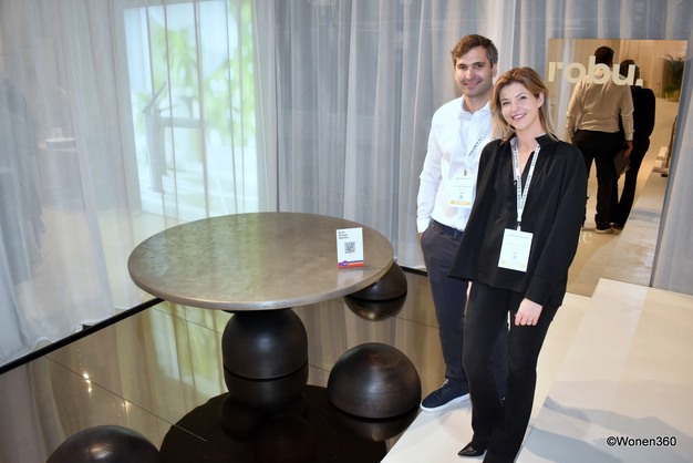 Michaël Deslypere met partner Charlotte Vanden Berghe van het Belgische tafel- en stoelenmerk Robu. Op Design Nation werd de nieuwe Ripple tafelcollectie gelanceerd. Het metalen tafelblad roept de sfeer van een rimpelend wateroppervlak op, balancerend op schijnbaar willekeurig gestapelde houten sferen.