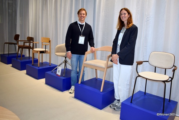 Sander de Geus en Nicole Berendsen in de stand van FreiFrau & Janua, dat onder meer een uitbreiding van de stoelencollectie Marie liet zien. "Zo wordt de familie steeds groter. Binnenkort komen er ook nog barstoelen bij", vertelde De Geus.