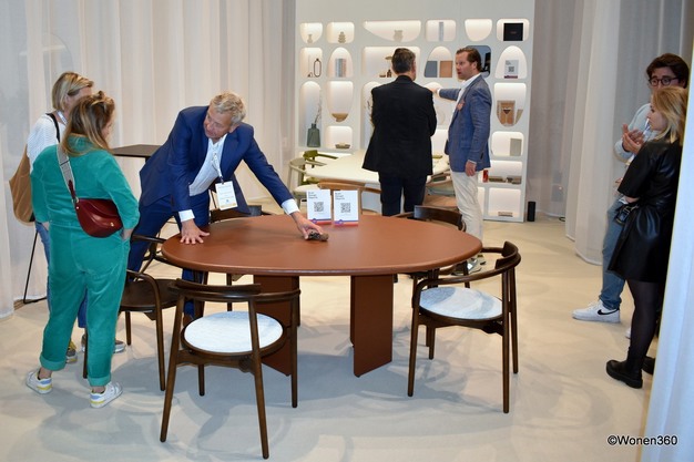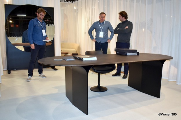 Een kijkje in de stand van kantoor- en projectinrichter Toon De Somer en meubelfabrikant TOOON. Toon De Somer (derde van links) geeft uitleg aan bezoekers over de nieuwste tafelcreatie, met op de achtergrond Anthony Coates die een andere belangstellende te woord staat.