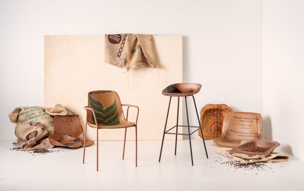 Vepa the furniture factory, specialist in duurzame meubelen, en Koffiebranderij Peeze hebben de handen ineengeslagen om afgeschreven jute koffiezakken een tweede leven te geven in de vorm van stijlvolle stoelen en barkrukken.